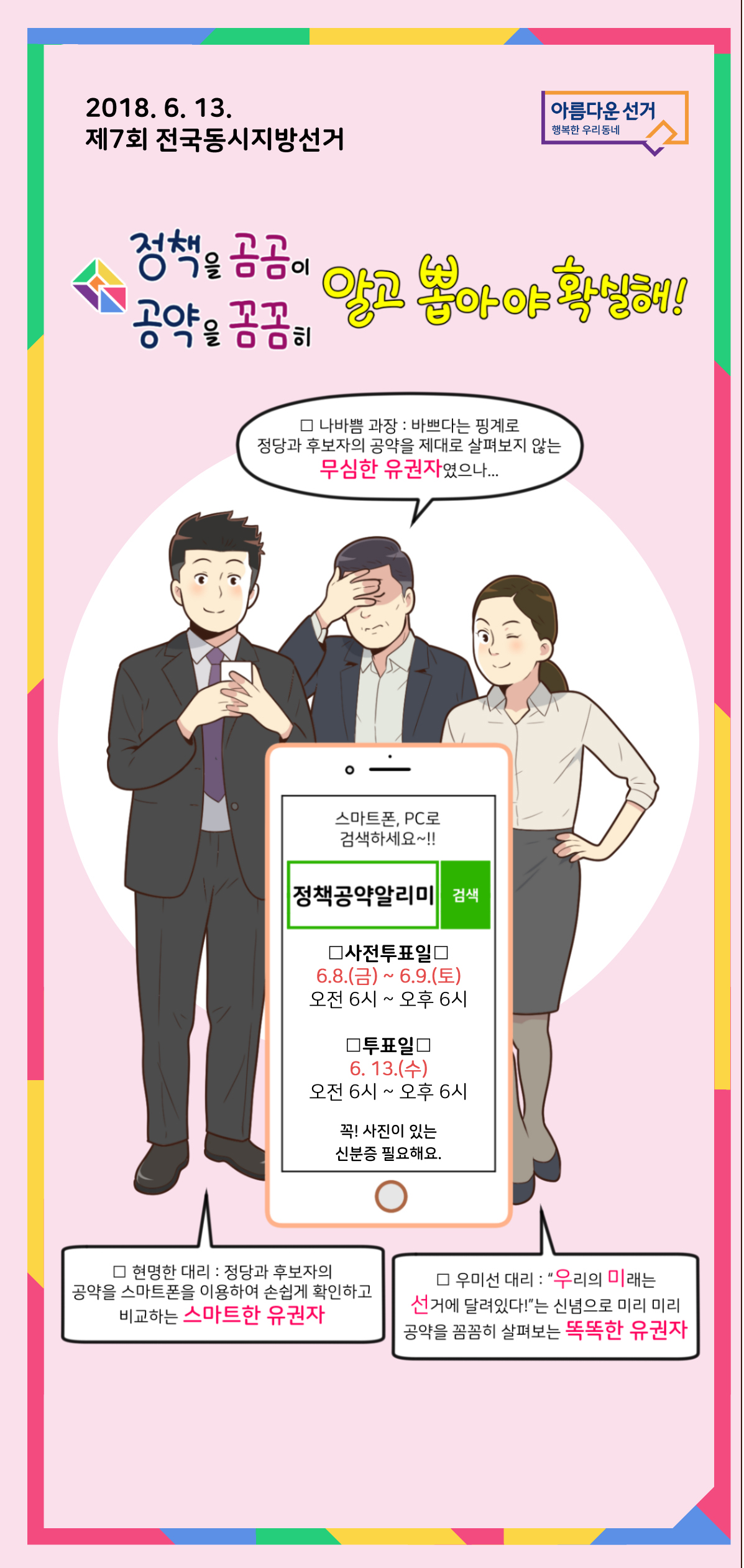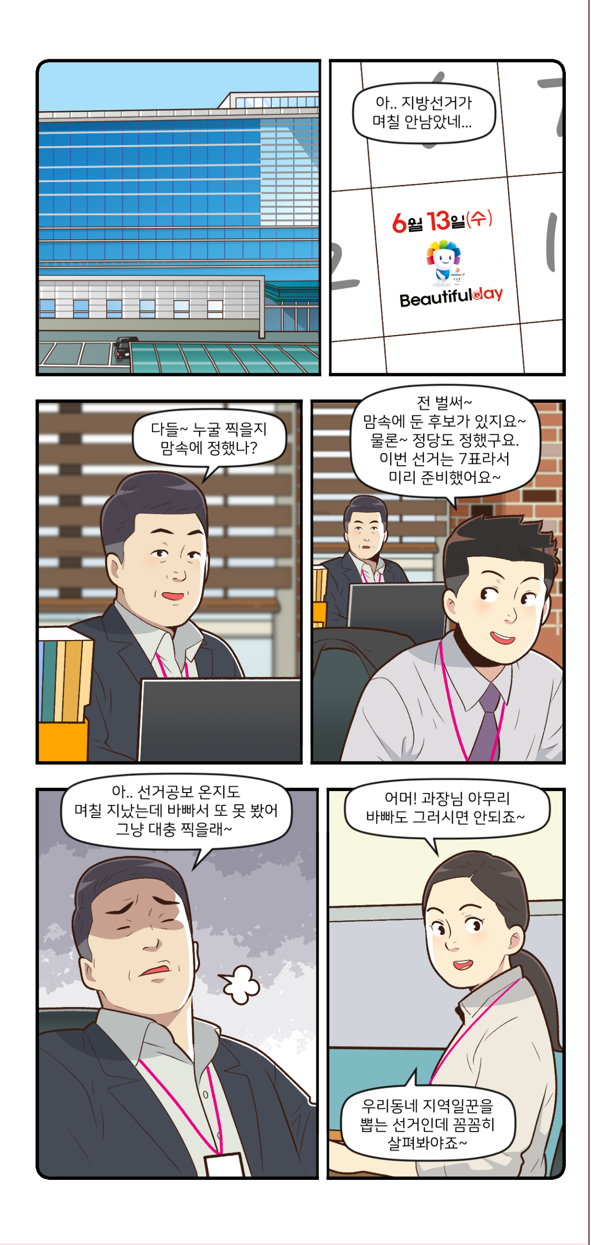 어머~ 과장님처럼 유권자가 모두 정책을 곰곰이, 공약일 꼼꼼히 살펴보고 투표하면 행복한 동네 만들 수 있겠어요~