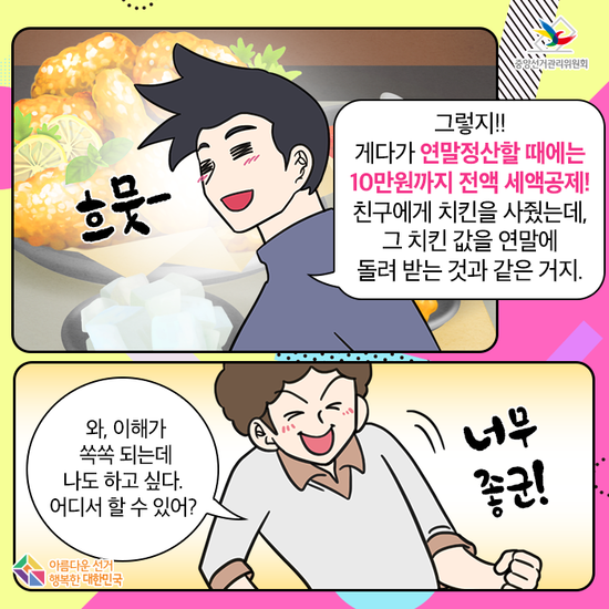 정치후원금 기부, 왜 필요할까? 남자1 : 정치후원금 기부가 왜 필요한 건데? 굳이 국민들이 후원금을 낼 필요가 있나? 그 돈으로 밥 한끼 더 먹는게 낫지 않겠어? 남자2 : 천만의 말씀! 정책개발이나 미원수렴 등 정치인의 정치활동에는 많은 비용이 필요해. 이를 정당 등이 전적으로 조달하는 데는 한계가 있어. 남자1 : 듣고보니 맞는말... 하긴 그러네. 특정인의 도움만 받으면 더 챙길 수 밖에 없겠지. 남자2 : 만약 정치후원금이 없이 특정인이나 특정계층 등 소수에 정치자금을 의존하게 되면 불법적인 자금 수수나 편향된 정치활동으로 이어질 수 있어. 그런데 특정계증이 아닌 국민들이 수액다수의 정치후원금을 기부한다면 어떨 것 같아? 남자1 : 그럼 누구한테 더 유리한 정치활동이 아니라, 국민을 위한 정치를 하게 되겠네? 남자2 : 그렇지! 게다가 연말정산할 때에는 10만원까지 전액 세액공제! 친구에게 치킨을 사줬는데, 그 치킨 값을 연말에 돌려 받는 것과 같은 거지. 남자1 : 와, 이해가 쏙쏙 되는데 나도 하고 싶다. 어디서 할 수 있어? 남자 2 : 포털사이트에서 정치후원금센터 (http://www.give.go.kr)를 검색하라구!