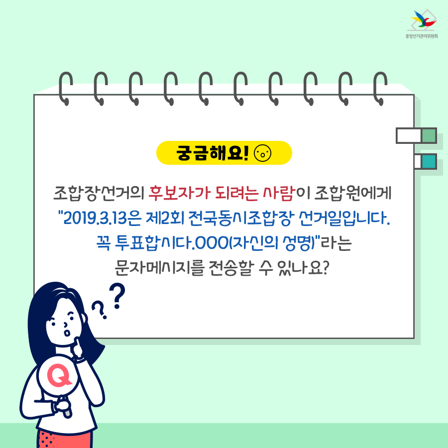 조합장선거의 후보자가 되려는 사람이 조합원에게 "2019.3.13은 제2회 전국동시조합장 선거일입니다. 꼭 투표합시다. OOO(자신의 성명)"라는 문자메시지를 전송할 수 있나요?