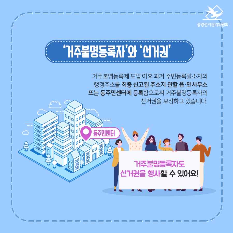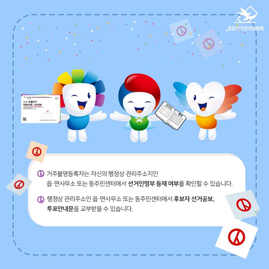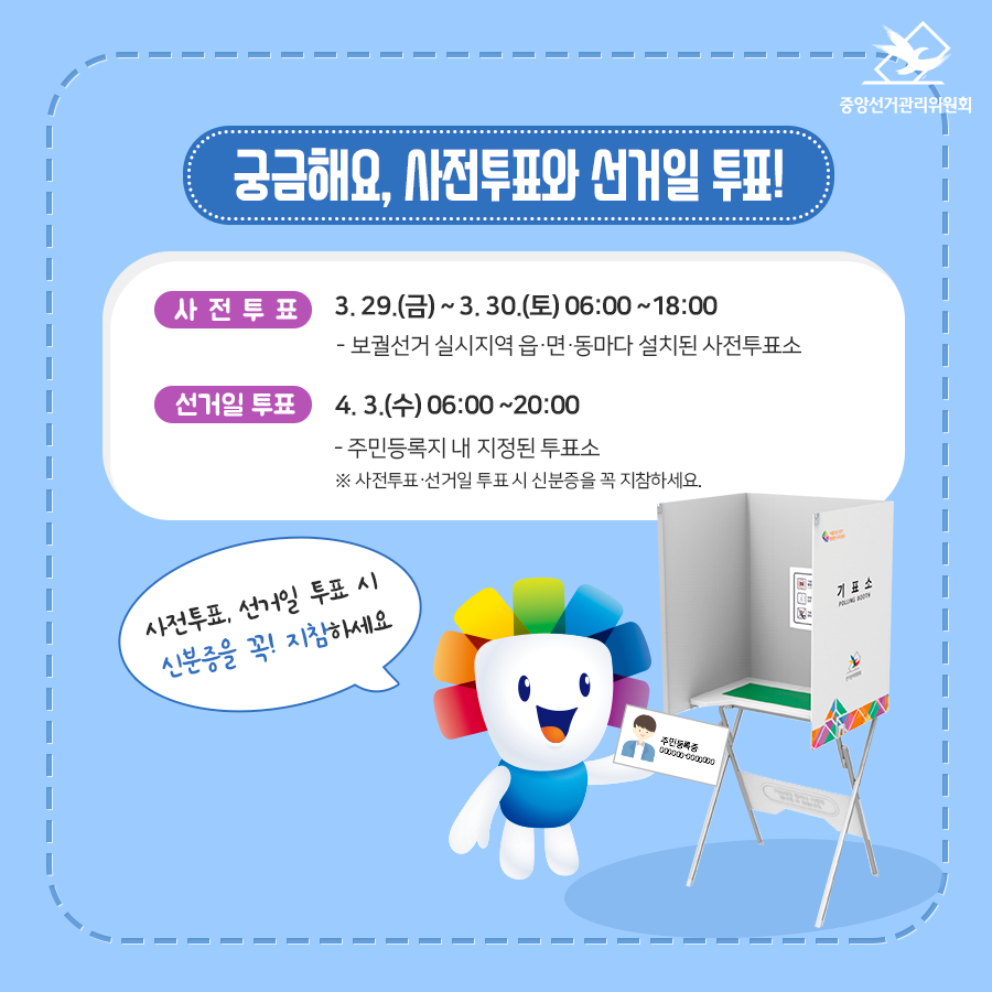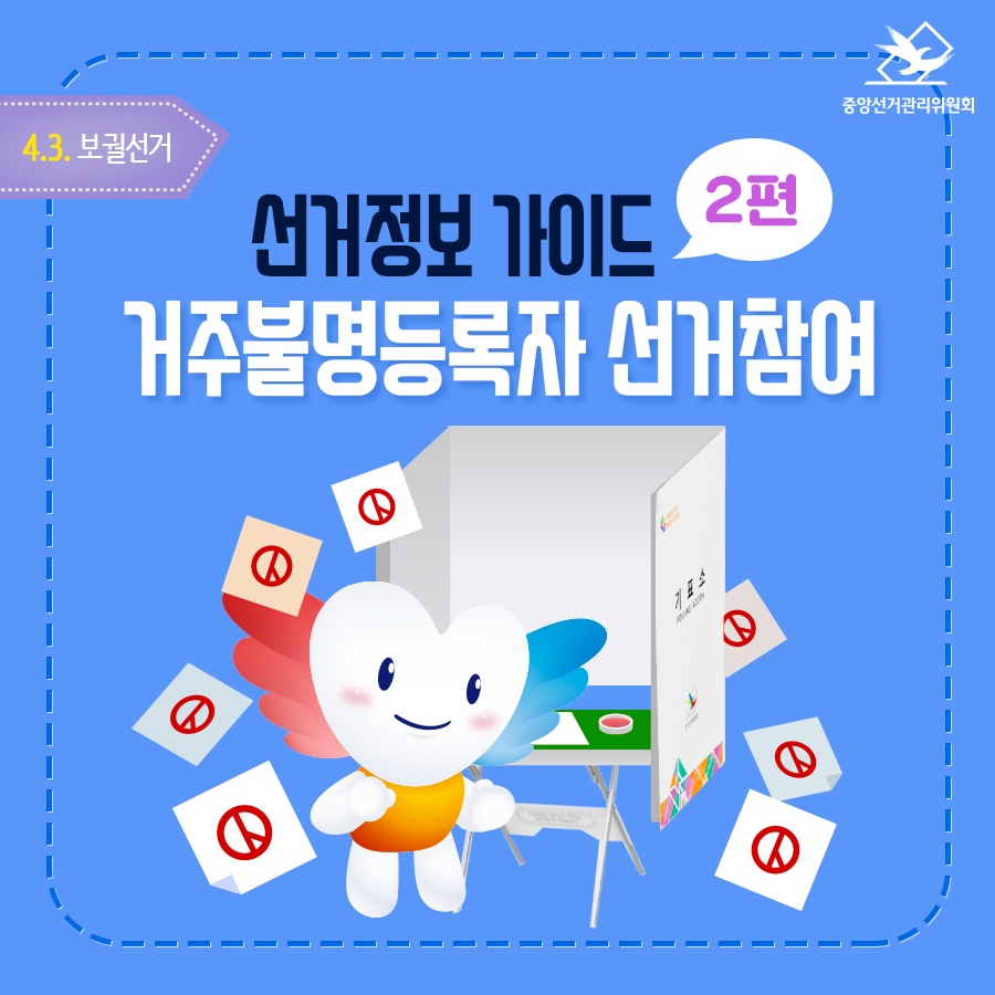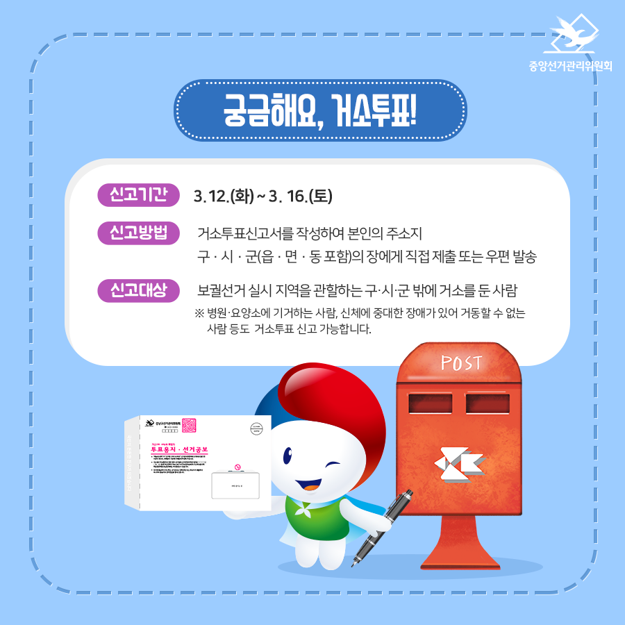 4.3. 보궐선거 선거정보 가이드 2편 거주불명등록자 선거참여 '거주불명등ㄺ자'와 '선거권' 거주불명등록제 도입 이후 과거 주민등록마소자의 행정주소를 최종 신고된 주소지 관할 읍ㆍ면사무소 또는 동주민센터에 등록함으로써 거주 불명등록자의 선거권을 보장하고 있습니다. 거주불명등록자도 선거권을 행사할 수 있습니다. 궁금해요, 거소투표! 신고기간 - 3.12.(화) ~ 3.16.(토) 신고방법 - 거소투표신고서를 작성하여 본인의 주소지 구ㆍ시ㆍ군(읍ㆍ면ㆍ동 포함)의 장에게 직접 제출 또는 우편발송 신고대상 - 보궐선거 실시 지역 관할하는 구ㆍ시ㆍ군 밖에 거소를 둔 사람 ※ 병원ㆍ요양소에 기거하는 사람, 신체에 중대한 장애가 있어 거동할 수 없는 사람 등도 거소투표 신고 가능합니다. 궁금해요. 사전투표와 선거일 투표! 사전투표 - 3.29.(금) ~ 3.3.(토) 06:00 ~ 18:00 -보궐선거 실시지역 읍ㆍ면 동마다 설치된 사전투표소 선거일 투표 - 4.3.(수) 06:00 ~ 20:00 -주민등록지 내 지정된 투표소 ※ 사전투표ㆍ선거일 투표시 신분증을 꼭 지참하세요. 거주불명등록지는 자신의 행정상 관리주소지인 읍ㆍ면사무소 또는 동주민센터에서 선거인명부 등재 여부를 확인할 수 있습니다. 행정상 관리주소인 읍ㆍ면사무소 또는 동주민센터에서 후보지 선거공보, 투표안내문을 교부받을 수 있습니다.