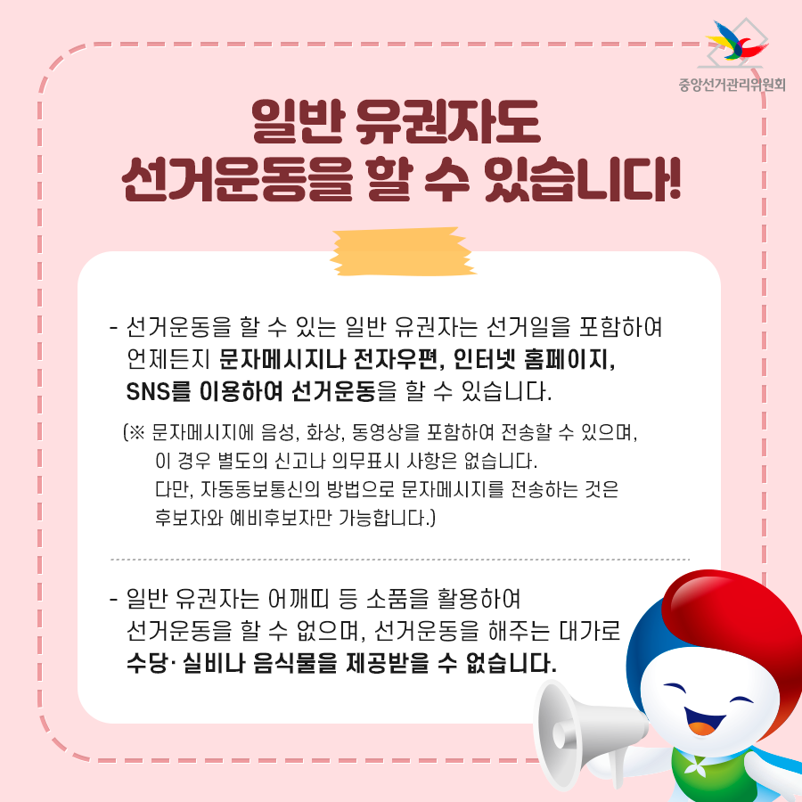 일반유권자도 선거운동을 할 수 있습니다! - 선거운동을 할 수 있는 일반 유권자는 선거일을 포함하여 언제든지 문자메세지나 전자우편, 인터넷 홈페이지, SNS를 이용하여 선거운동을 할 수 있습니다.