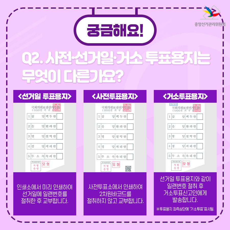 Q2. 사전, 선거일, 거소 투표용지는 무엇이 다른가요?