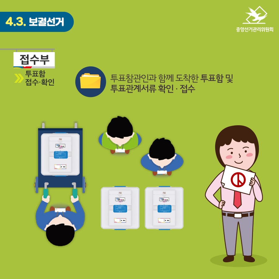 접수부 : 투표함 접수ㆍ확인 투표참관인과 함께 도착한 투표함 및 투표관계서류 확인ㆍ접수