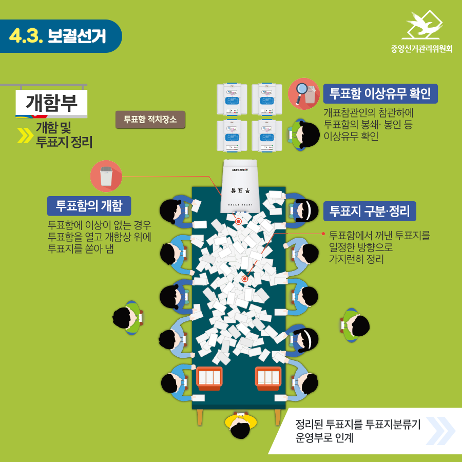 개함부 : 개함 및 투표지 정리 투표함 이상유무 확인 - 개표참관인의 참관하에 투표함의 봉쇄ㆍ봉인 등 이상유무 확인