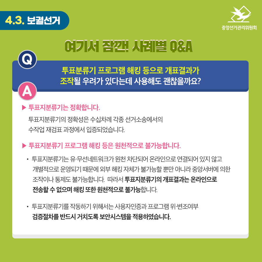 Q : 투표분류기 프로그램 해킹 등으로 개표결과가 조작될 우려가 있다는데 사용해도 괜찮을까요?