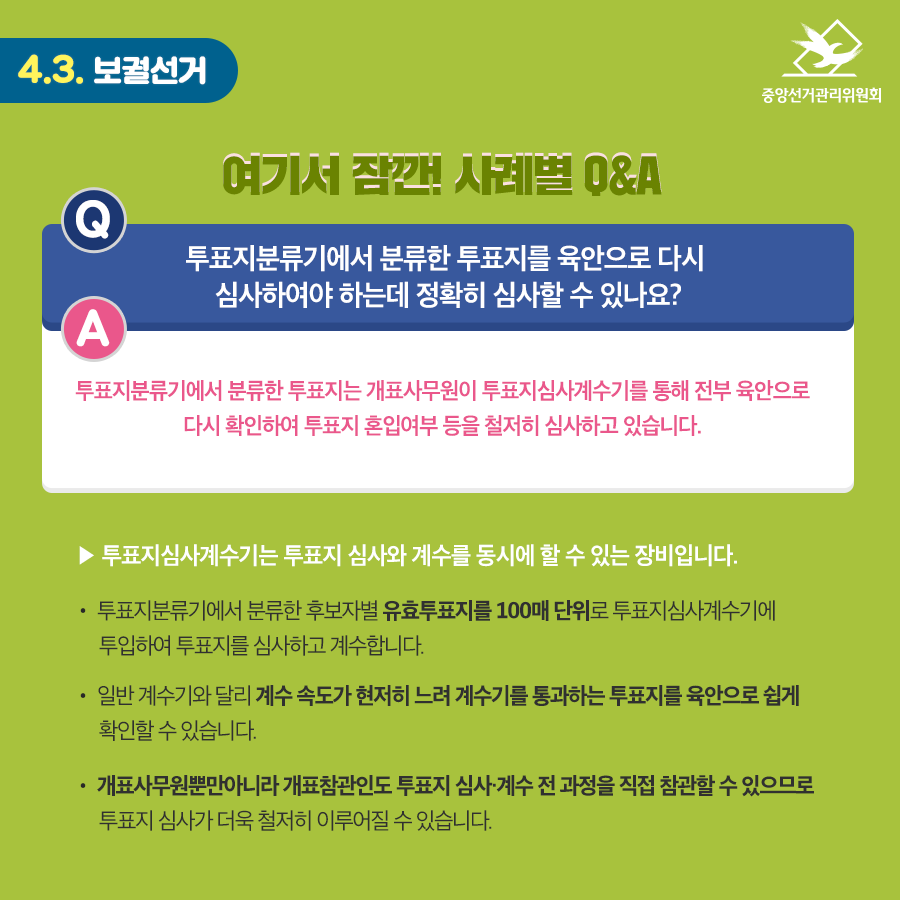 A : 투표지분류기에서 분류한 투표지는 개표사무원이 투표지심사계수기를 통해 전부 육안으로 다시 확인하여 투표지 혼입여부 등을 철저히 심사하고 있습니다.