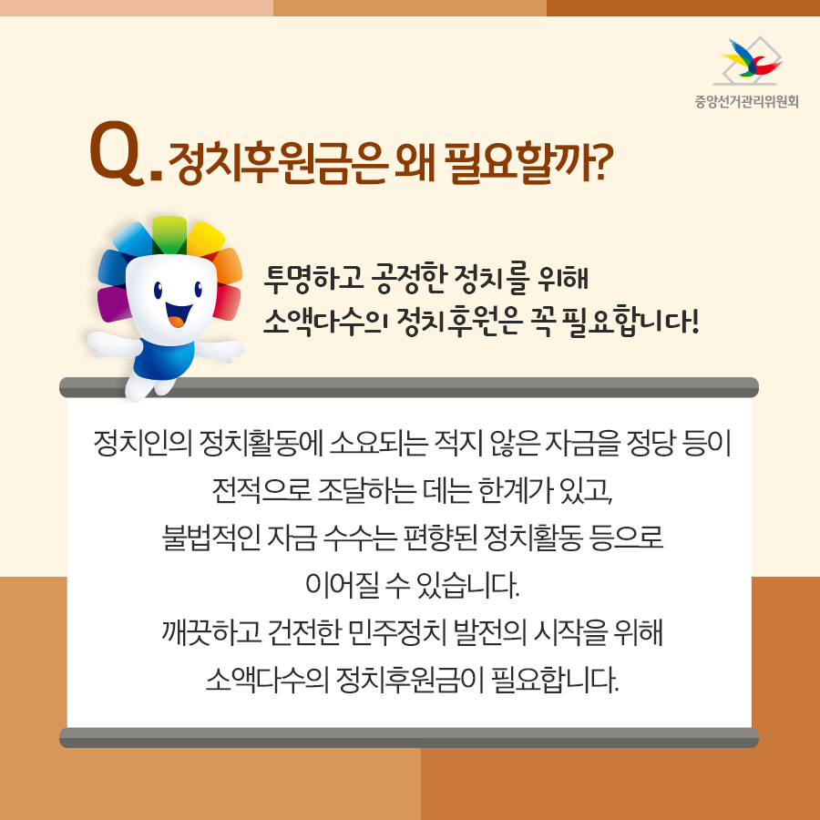 때문에 깨끗하고 건전한 민주정치 발전의 시작을 위해서는 소액다수의 정치후원금 기부문화 정착이 필요합니다.