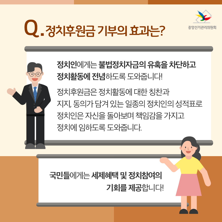 많은 분들이 궁금해하는 부분이죠. 정치후원금은 과연 어떤 효과를 가져올까요? 정치인에게는 불법정치자금의 유혹을 차단하고 정치활동에 전념하도록 도와줍니다!