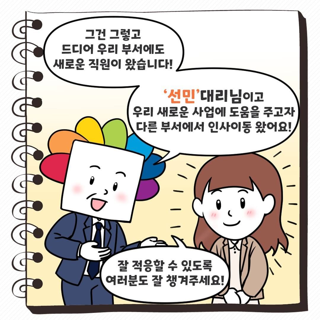 '선민'대리님이고 우리 새로운 사업에 도움을 주고자 다른 부서에서 인사이동 왔어요!