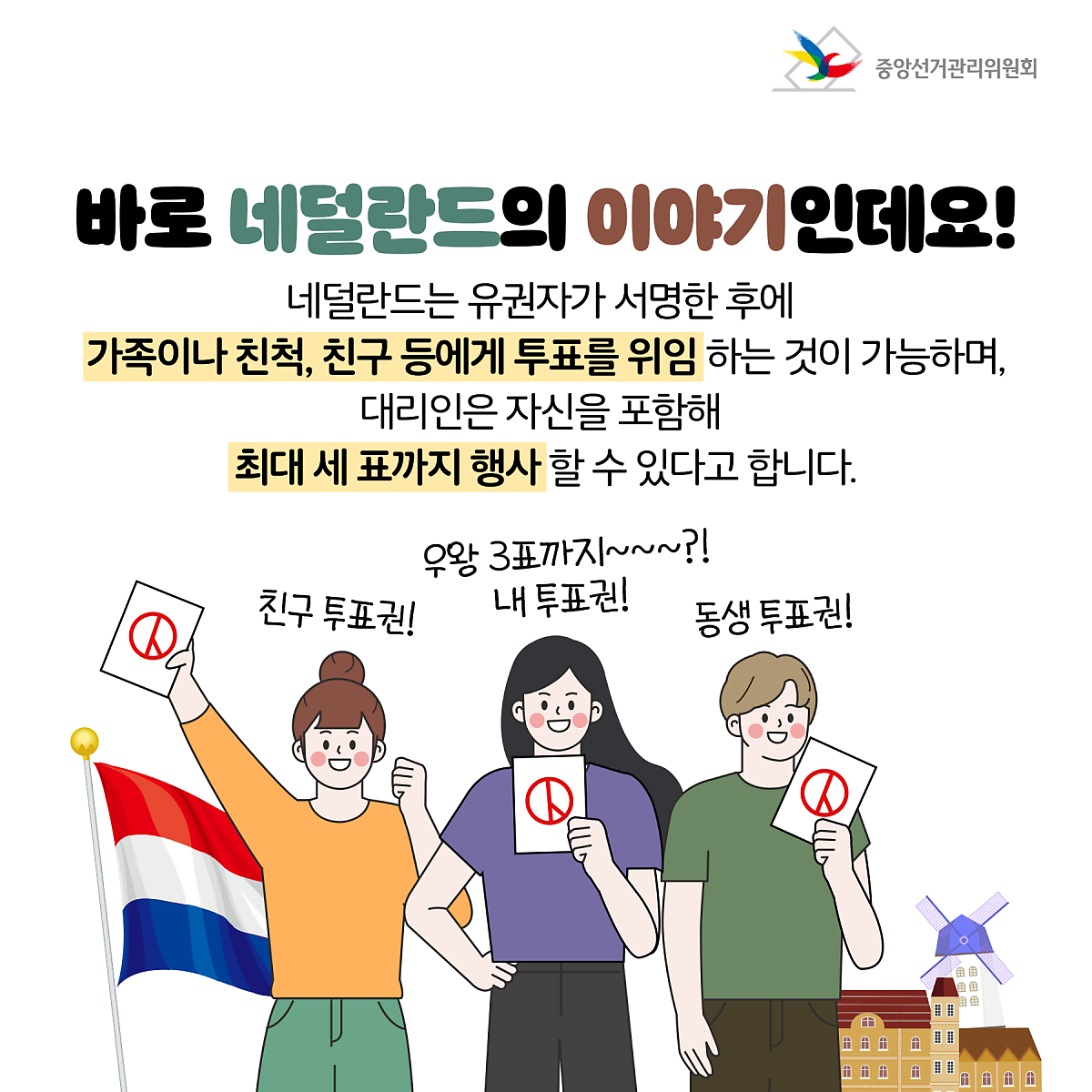 네덜란드는 유권자가 서명한 후에 가족이나 친척, 친구 등에게 투표를 위임하는 것이 가능하며, 대리인은 자신을 포함해 최대 세 표까지 행사할 수 있다고 합니다.