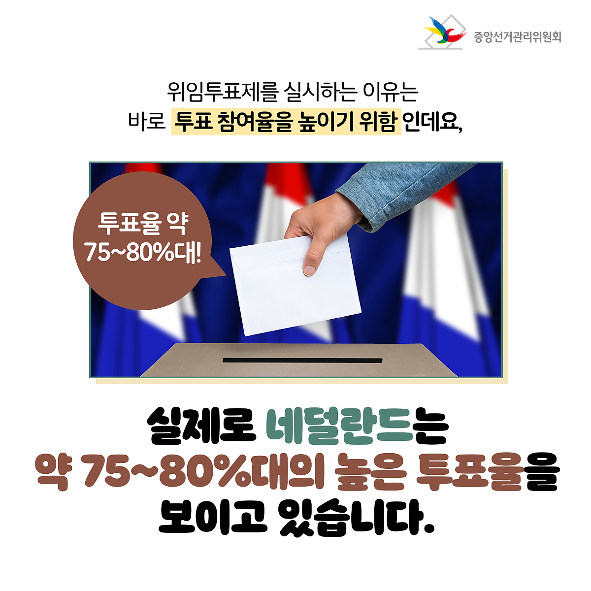 위임투표제를 실시하는 이유는 바로 투표 참여율을 높이기 위함인데요, 실제로 네덜란드는 약 75~80%대의 높은 투표율을 보이고 있습니다.