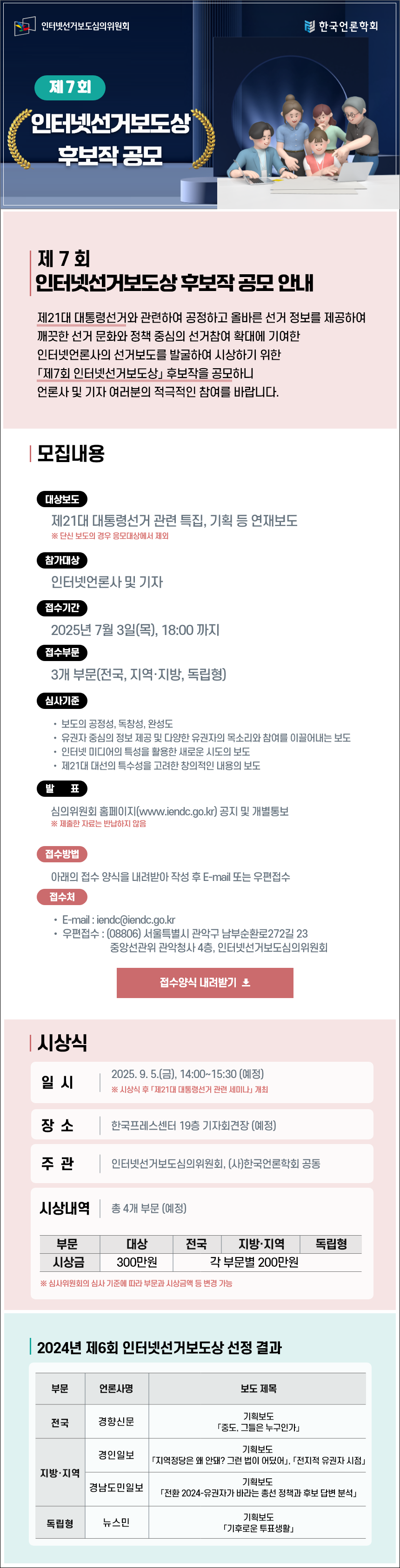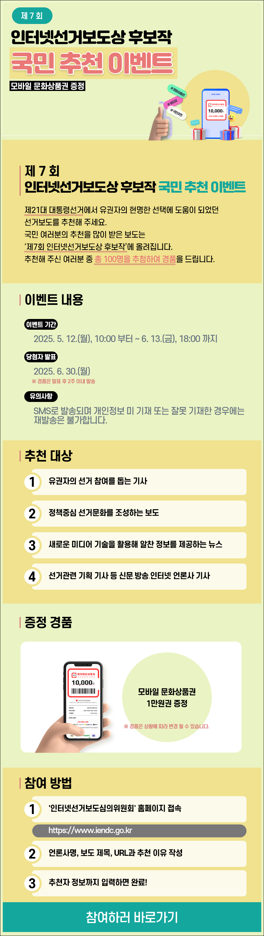 공공누리 마크 공보과(02-3294-1006)에서 제작한 제7회 인터넷선거보도상 공모 및 국민 추천 이벤트 실시 저작물은 "공공누리" 출처표시 조건에 따라 이용할 수 있습니다. 자세한 내용은 [저작권정책]을 확인하십시오.
