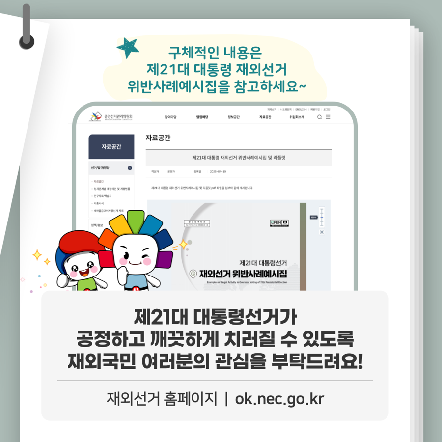 구체적인 내용은 제21대 대통령 재외선거 위반사례예시집을 참고하세요~