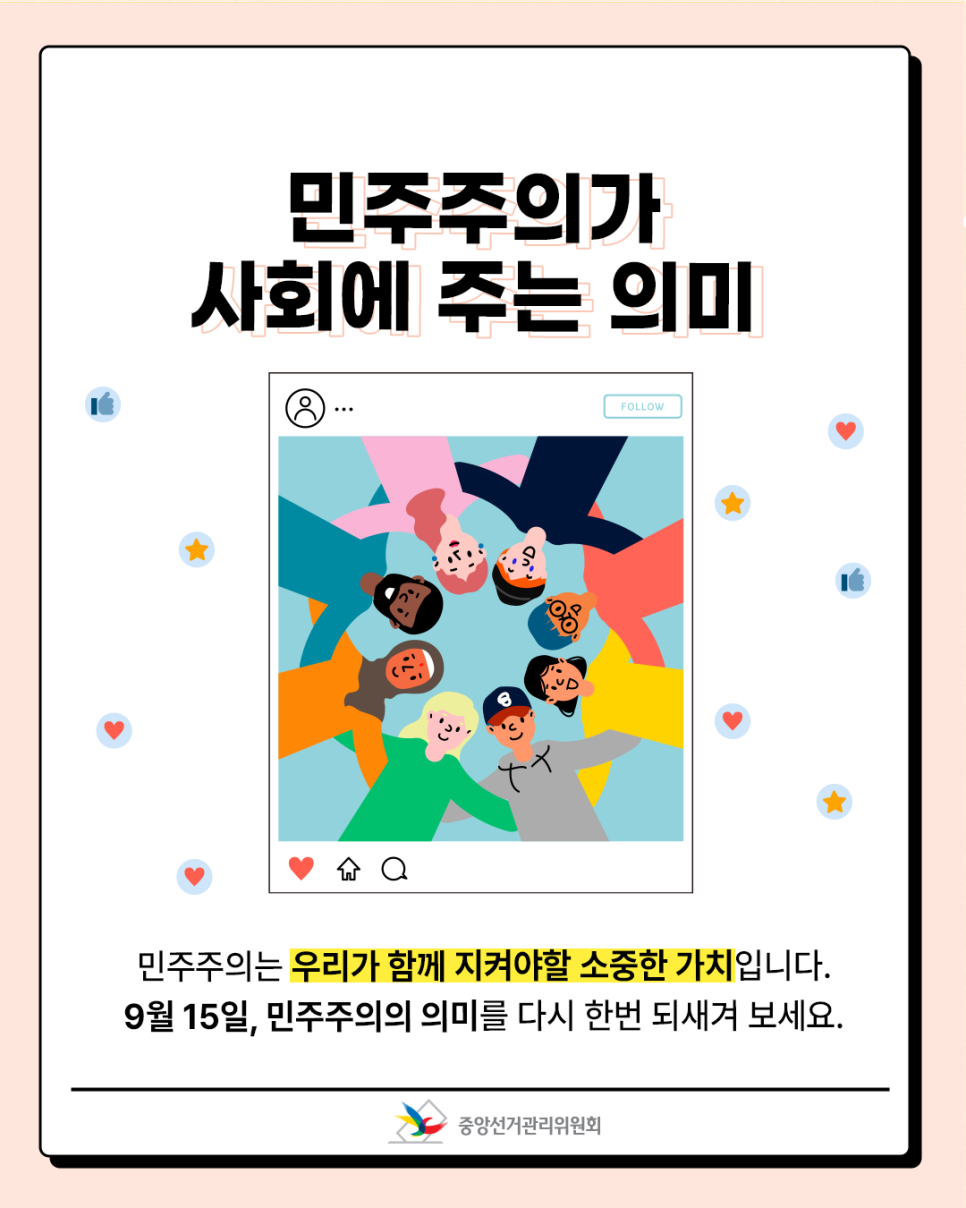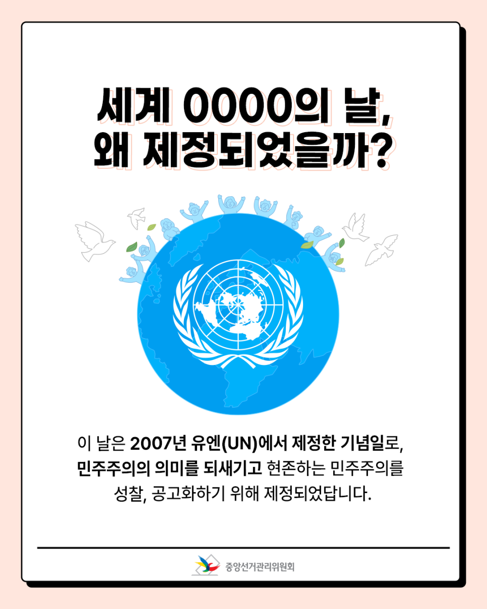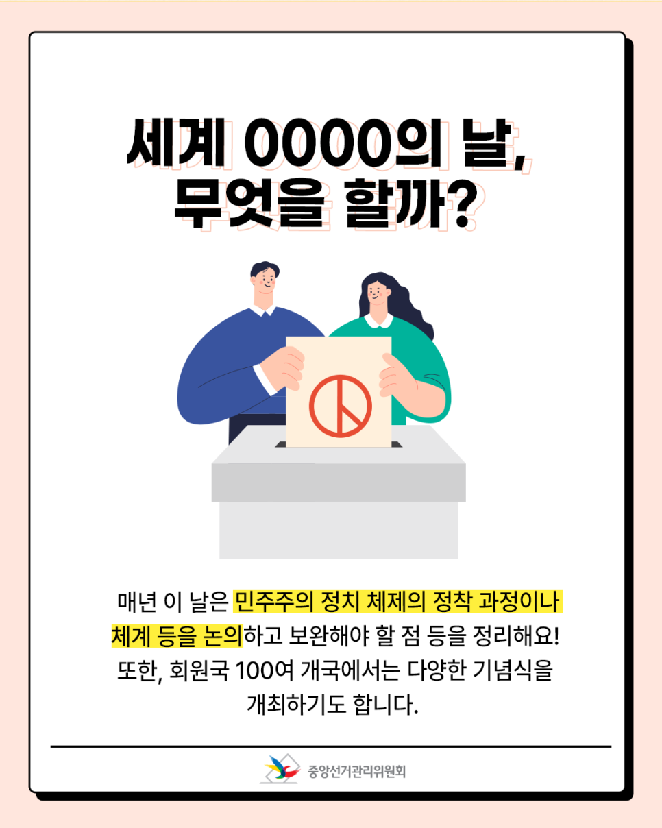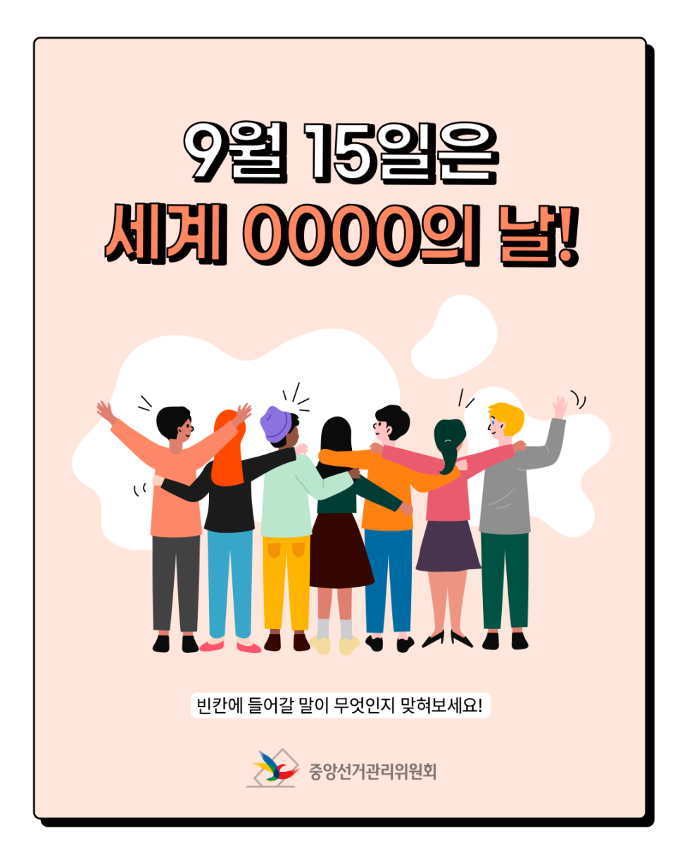 공공누리 마크 홍보과(02-3294-1034)에서 제작한 9월 15일은 세계 민주주의의 날! 저작물은 "공공누리" 출처표시-상업적 이용금지-변경금지 조건에 따라 이용할 수 있습니다. 자세한 내용은 [저작권정책]을 확인하십시오.