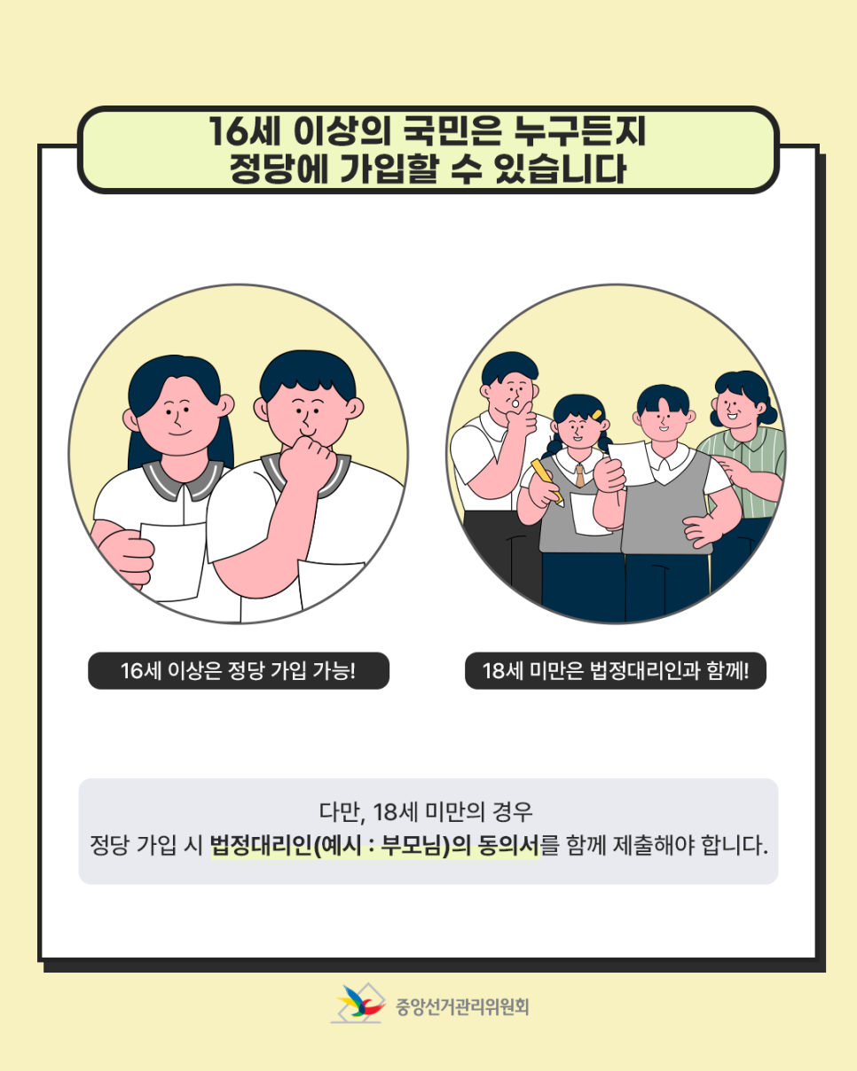 정당 가입 시 법정대리인(예시 : 부모님)의 동의서를 함께 제출해야 합니다.